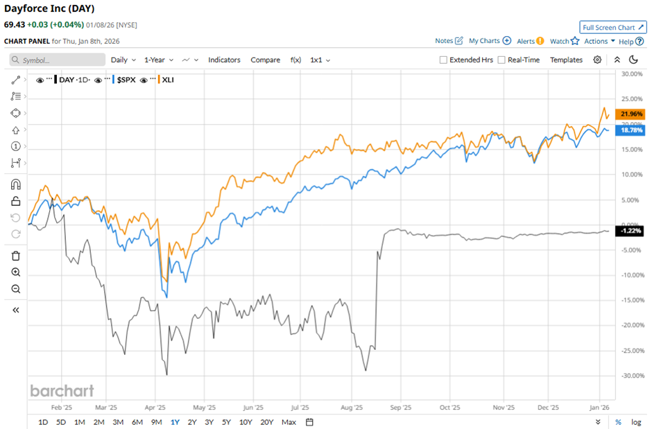 Shares of Dayforce have declined 1% over the past 52 weeks, underperforming the broader S&P 500 Index's ($SPX) nearly 17% return and the State Street Industrial Select Sector SPDR ETF's (XLI) 20.6% gain over the same period.